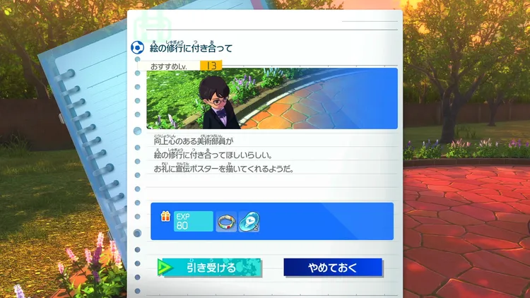 試合に勝利すると美術部員から話しかけられクエスト完了となる。