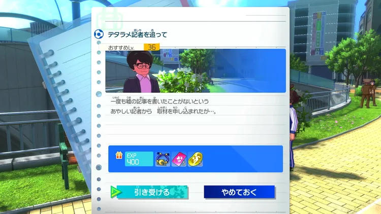 怪しい記者に話しかけることでイベントが進行しクエストクリアとなる。