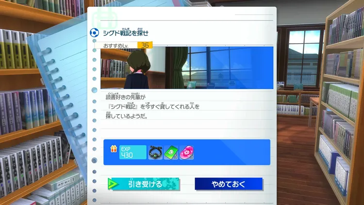 図書室に戻り、再度先輩に話しかけることでクエストクリアとなる。