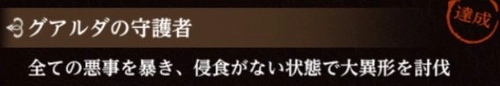 4周目で解決することになる城塞の陰謀を暴きつつ、侵食0の大異形を倒せばグアルダ城塞は完全クリアとなり、隠し実績「グアルダの守護者」が手に入る。