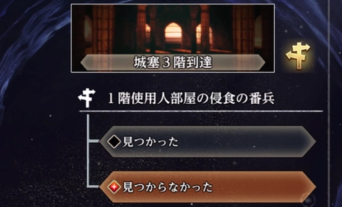 | 城塞3階到達 | ・1階使用人部屋の侵食の番兵 ・1階南西の侵食の番兵 ・2階兵士の部屋の侵食の番兵 ・2階閉じ込めの罠の侵食の番兵 |
