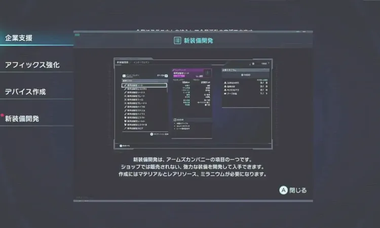 アームズカンパニーでは各種装備品の「空きスロット」にセットできる「デバイス」を作成することができる。