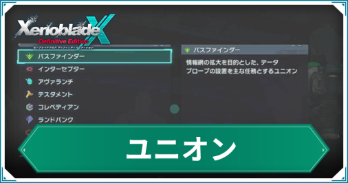 ゼノブレイドクロスDE(XenobladeXDE)の「ユニオンの種類と所属のやり方|所属変更はできる?」について掲載しています。ユニオンに所属するメリットや報酬をまとめていますので、ゼノブレイドクロス ディフィニティブエディション(Switch)の攻略にお役立てください。