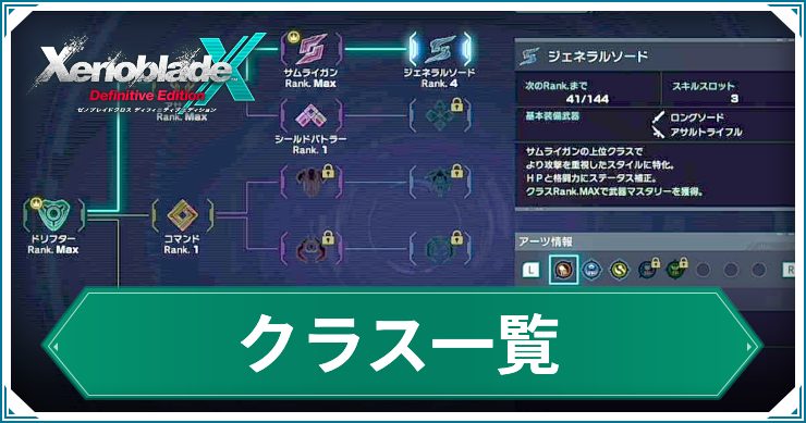 ゼノブレイドクロスDE(XenobladeXDE)の「クラス一覧」です。各クラスと前提となるクラスを一覧形式でまとめていますので、ゼノブレイドクロス ディフィニティブエディション(Switch)の攻略にお役立てください。