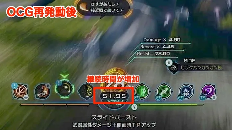 OCGを途切れさせないためにはOCG発動中にOCGを再発動し継続時間を延長することが必要。