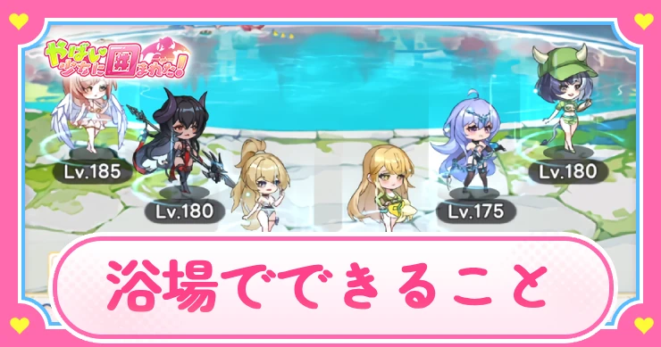 ヤバ少女の浴場でできることを掲載しています。ヤバ少女で浴場の仕様や注意点、レベル上限突破のやり方、契約の仕様をまとめていますので、浴場を使用する際は参考にご覧ください。