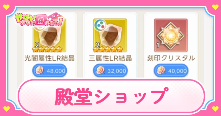 殿堂ショップでは女神フラワーと殿堂ポイントを使って、キャラの強化素材や結晶などのアイテムと交換することができる。