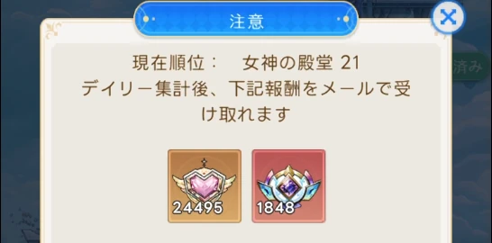 殿堂ポイントは郊外コンテンツの「少女の殿堂」で入手することができ、ランキングに応じて毎日貰える報酬が異なる。