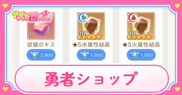 勇者ショップでは勇者ポイントを使って、欲望召喚に必要な欲望のキスや星5三属性結晶、覚醒紋章などを交換することができる。