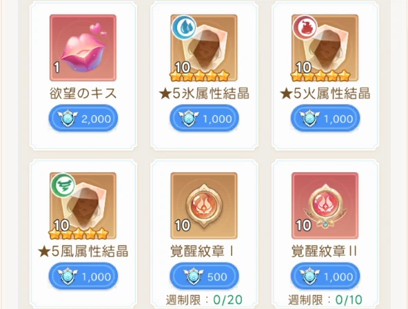 覚醒紋章と覚醒リセットポーションには毎週の交換制限があるが、欲望のキスと星5三属性結晶には制限はないので、必要な分だけ交換しよう。
