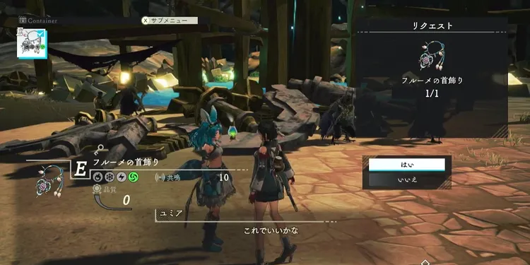 レシピ想起台でフルーレの首飾りのレシピを作成後、調合してレイニャに渡そう。品質は最低限で問題ない。