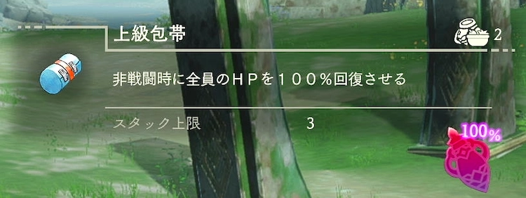上級包帯を非戦闘時に使うことで、味方のHPを100%回復することができる。