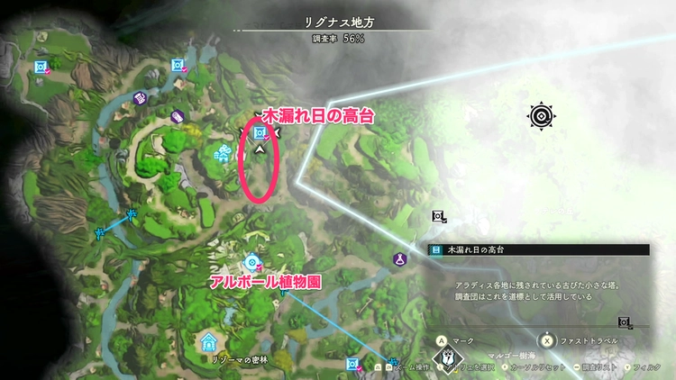 黄色い鉱石の採掘場所は、アルボール植物園の北にあるしるべの古塔「木漏れ日の高台」付近がおすすめ。「木漏れ日の高台」から、南方向へ続く道沿いで黄色い鉱石をまとめて採掘可能だ。