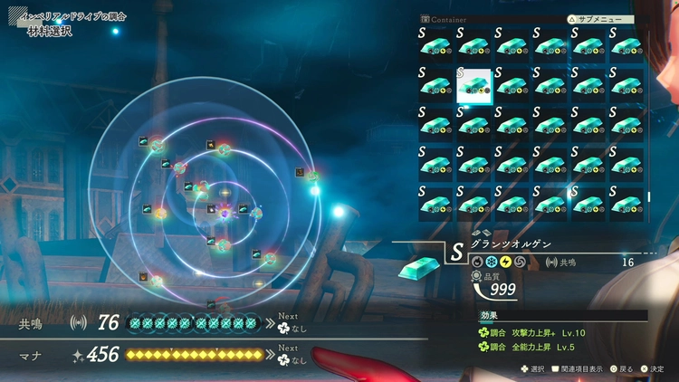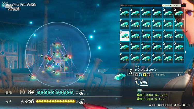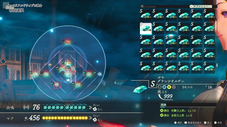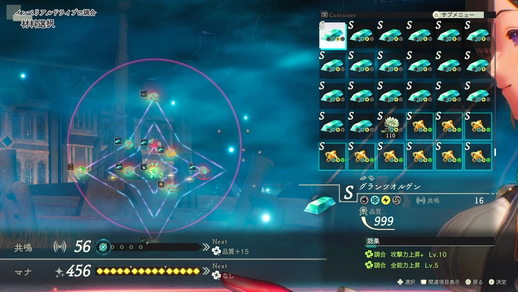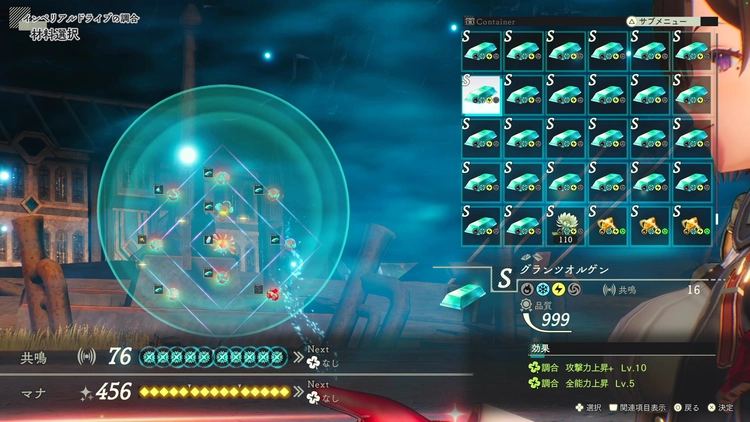 素材となる調合アイテムは装備ほど厳重に作る必要はないが、調合スキルで「共鳴範囲強化(完成品の共鳴範囲+2)」を選択して作成しよう。