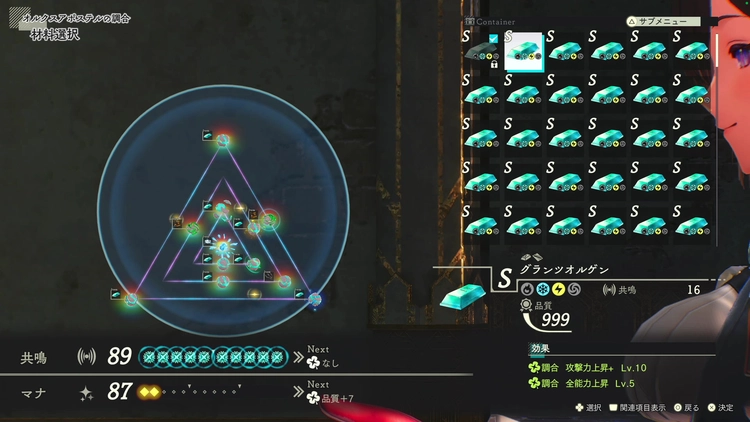 素材となる調合アイテムは装備ほど厳重に作る必要はないが、調合スキルで「共鳴範囲強化(完成品の共鳴範囲+2)」を選択して作成しよう。