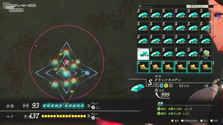 素材となる調合アイテムは装備ほど厳重に作る必要はないが、調合スキルで「共鳴範囲強化(完成品の共鳴範囲+2)」を選択して作成しよう。