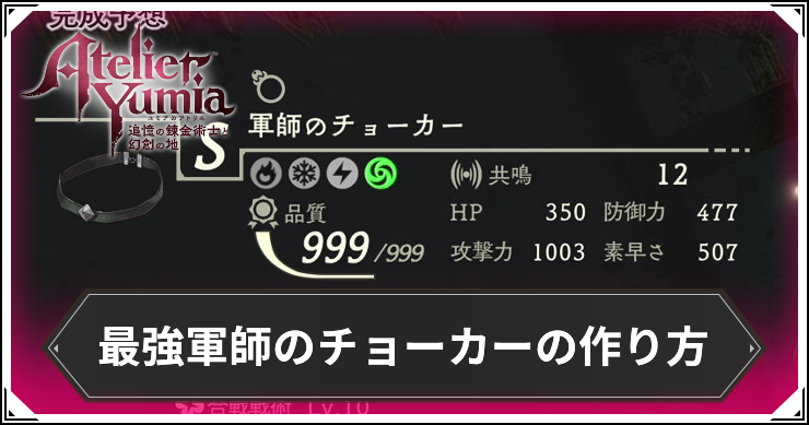 ユミアのアトリエの最強の「軍師のチョーカー」を作成する手順を掲載しています。事前準備や作成の流れをチャート形式でまとめていますので、ユミアのアトリエの攻略にお役立てください。