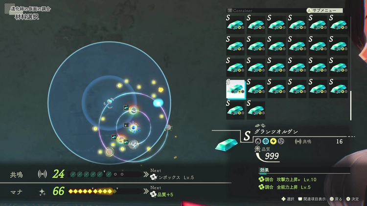 下記作り方は全て共鳴範囲強化の素材を用いているため、選択していない場合は再現できない可能性があるので注意が必要。